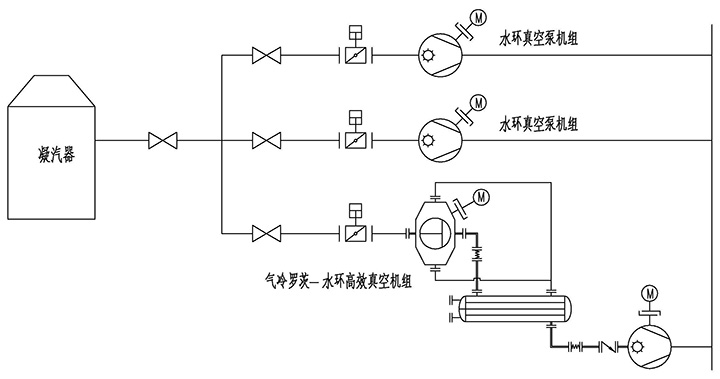 不改變原水環(huán)式抽真空系統(tǒng)的設(shè)備及功能,在抽真空主管道上并接一套羅茨—水環(huán)高效真空機(jī)組。
