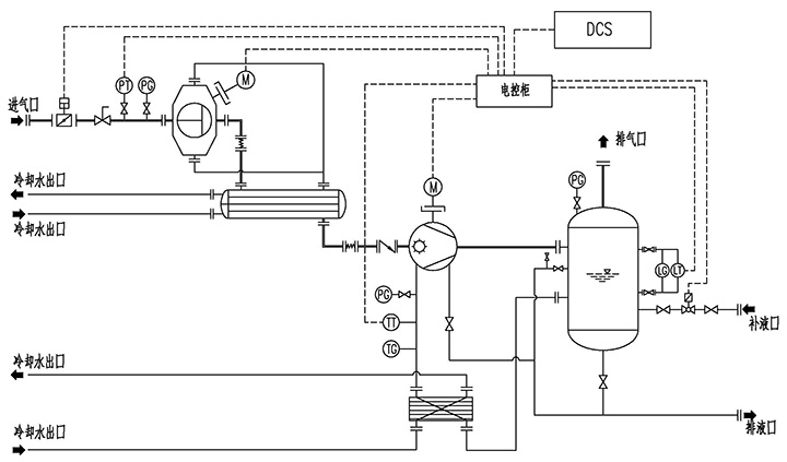 具體的思路為,不改變原裝置中的水環(huán)式抽真空系統(tǒng)的設(shè)備及功能,在抽真空主管道上并接一套羅茨—水環(huán)高效真空機(jī)組。在機(jī)組啟動建立真空期間,首先由原裝置水環(huán)式抽真空系統(tǒng)進(jìn)行快速預(yù)抽,以達(dá)到啟動真空,在正常運(yùn)行保持真空階段,使用羅茨—水環(huán)高效真空機(jī)組進(jìn)行維持真空。