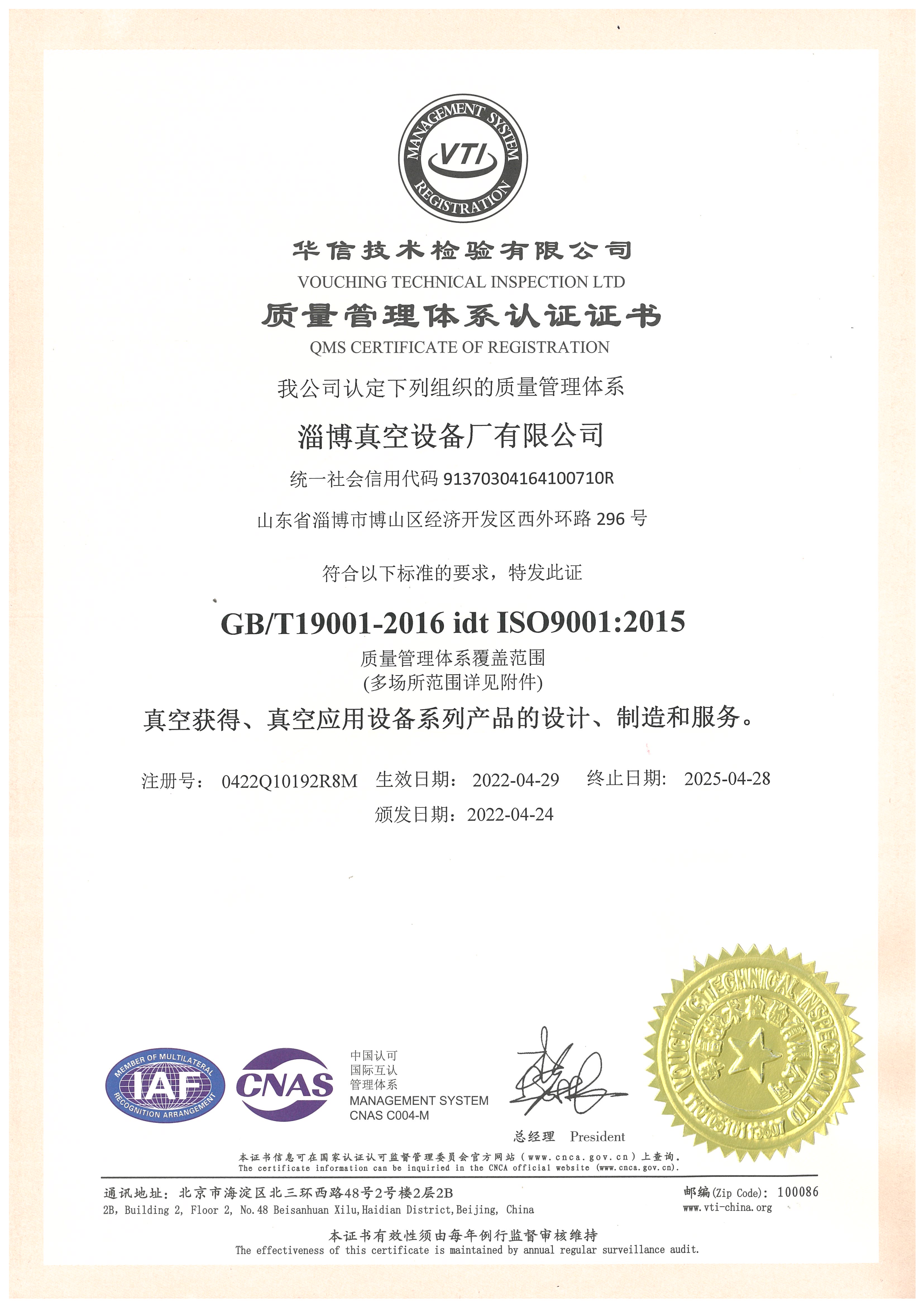 質(zhì)量管理體系認證證書