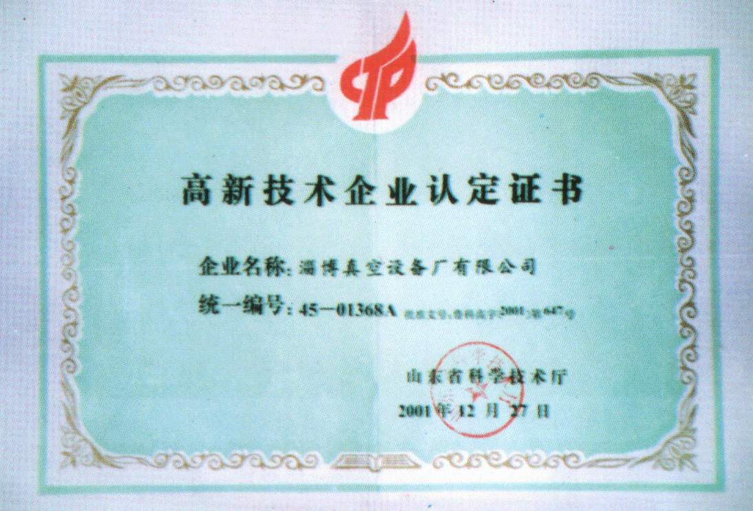 2001年山東省科學(xué)技術(shù)廳授予公司高新技術(shù)企業(yè)認定證書