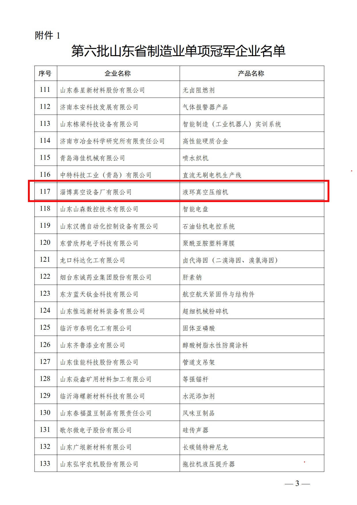 8月18日,山東省工業(yè)和信息化廳、山東省工業(yè)經(jīng)濟(jì)聯(lián)合會聯(lián)合發(fā)布《關(guān)于公布第六批山東省制造業(yè)單項冠軍企業(yè)、單項冠軍產(chǎn)品和通過復(fù)核的第三批制造業(yè)單項冠軍企業(yè)名單的通知》,公司憑借液環(huán)真空泵及壓縮機(jī)較高的市場占有率和細(xì)分行業(yè)領(lǐng)域領(lǐng)軍地位,榜上有名。這是繼公司2020年搬遷以來榮獲山東省專精特新中小企業(yè)、山東省瞪羚企業(yè)、山東省軍民融合企業(yè)和淄博市綠色工廠以后又一項殊榮!