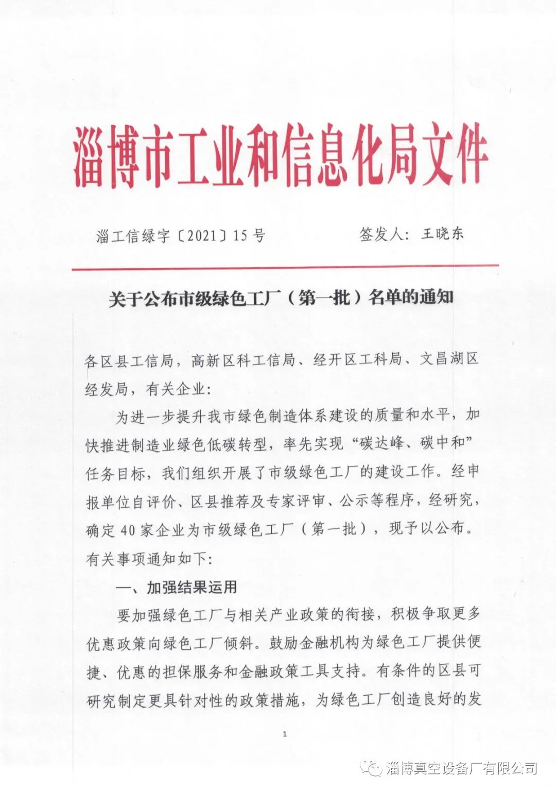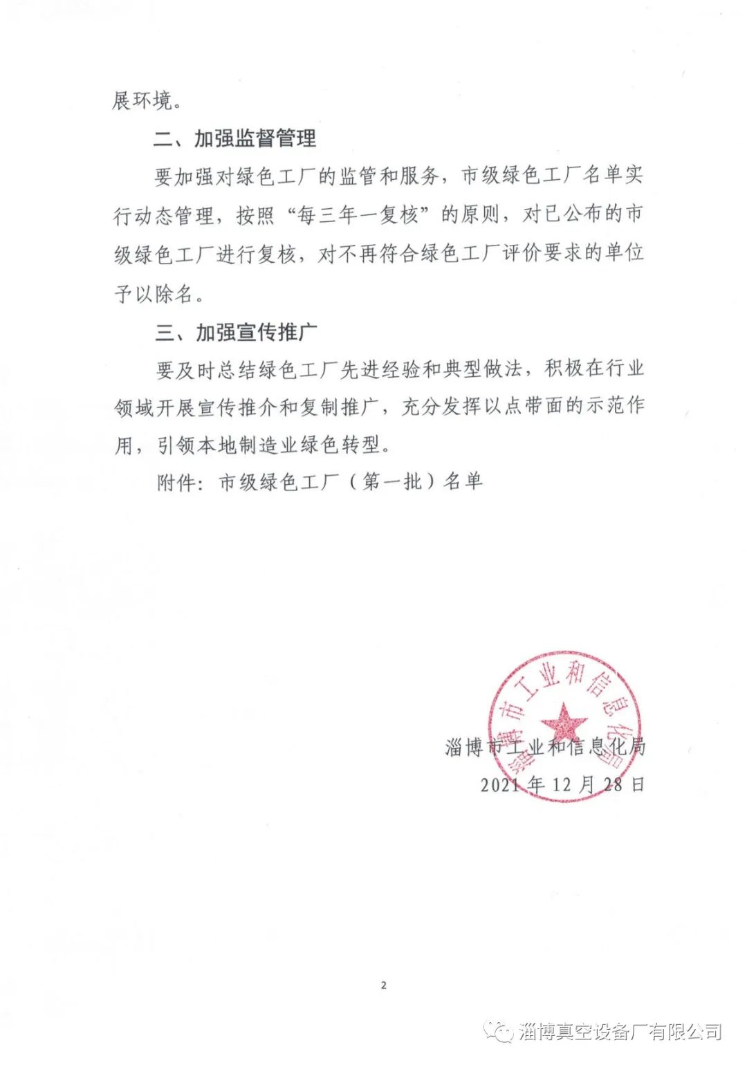 淄博真空設(shè)備廠有限公司獲得淄博市第一批“綠色工廠“榮譽(yù)稱號(hào)”