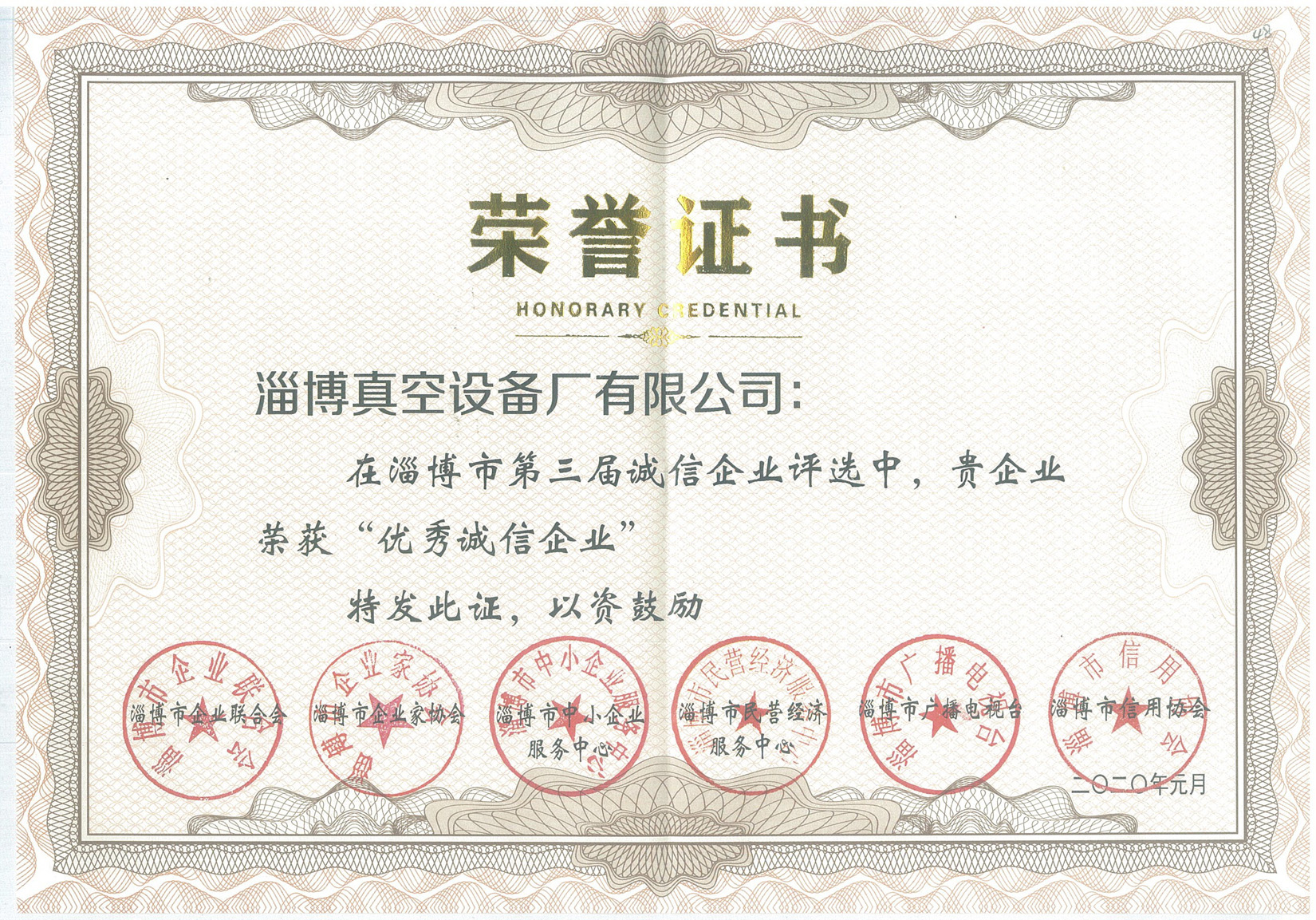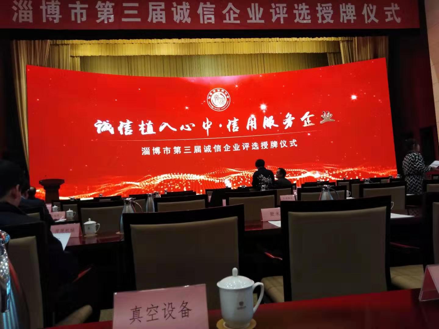 2020年1月9日,淄博市第三屆誠信企業(yè)授牌儀式在山東齊盛國際賓館會議中心隆重舉行。在本次評選授獎活動中,淄博真空設(shè)備廠有限公司再次被評為“淄博市優(yōu)秀誠信企業(yè)”。