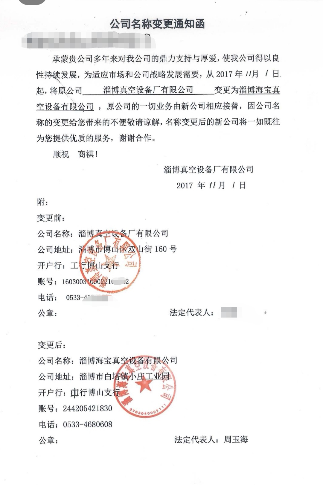 淄博海寶真空設備有限公司未經我公司授權,私自出具變更函,給客戶和我公司帶來了巨大影響,該變更函純屬海寶真空私自偽造,提醒廣大用戶接收到類似變更函,一定要先與我公司核實,避免造成重大損失。
